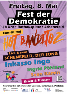 Am 8. Mai verwandelt sich der Rathausplatz in Schenefeld in eine lebendige Bühne für Musik, Begegnung und gelebte Demokratie – mitreißende Acts wie Hot Banditoz, Inkasso Ingo und mehr sorgen für beste Stimmung. Kommt vorbei, genießt Essen & Trinken bei freiem Eintritt und erlebt einen Abend, der Gemeinschaft spürbar macht!