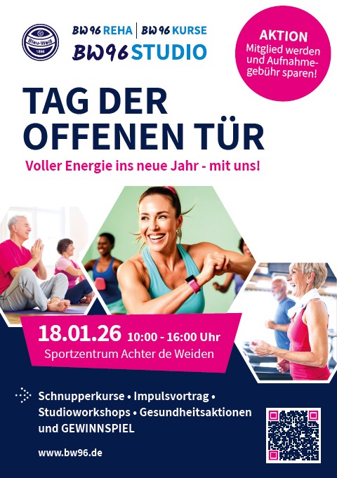 Neues Jahr, neuer Schwung: Beim Tag der offenen Tür zeigen wir Dir, wie einfach aktiver Leben sein kann! Probiere unsere Schnupperkurse aus, entdecke das Studio, informiere dich über unser ganzeitliches Angebot mit Rehasport, Ernährungsberatung und Liebscher Bracht-Anwendungen. Highlight des Tages: der inspirierende Vortrag „Starte deine Energiewende – mehr Energie, Regeneration und Balance im Alltag“.